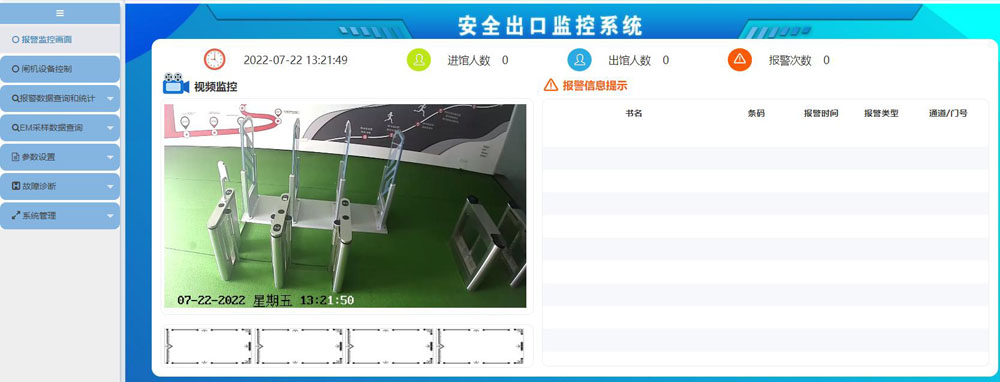 04 跟出口門禁和大屏進行聯動:智能檢測終端與出口門禁聯動,當報警時,出口門禁自動關閉,讀者無法通過,同時視頻監控啟動拍照功能,記錄報警畫面,數據大屏顯示監控視頻和報警圖書信息。